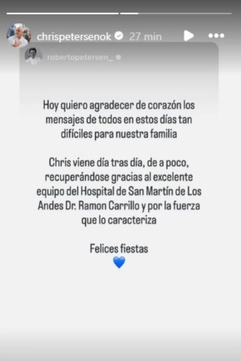 A través de las historias de Instagram del cocinero, la familia publicó una carta cargada de emoción y gratitud. «En esta Navidad, los Petersen nos sumamos a la jornada festiva en agradecimiento por la franca mejoría de Chris», expresaron, al tiempo que destacaron el trabajo del personal médico que lo asistió tanto en Junín como en San Martín de los Andes, donde fue atendido inicialmente tras el episodio en la montaña.