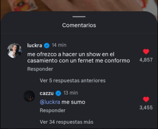 Entre los primeros famosos en comentar estuvo Luck Ra, quien escribió: “Me ofrezco a hacer un show en el casamiento, con un fernet me conformo”, propuesta que fue rápidamente respaldada por Cazzu, quien respondió: “Me sumo”. A la catarata de mensajes se sumaron figuras como Esteban Lamothe, Candela Vetrano, Celeste Cid, Ofelia Fernández, Nathy Peluso, Carla Peterson y Gianinna Maradona, dejando en claro el peso que la pareja tiene dentro del mundo del espectáculo.