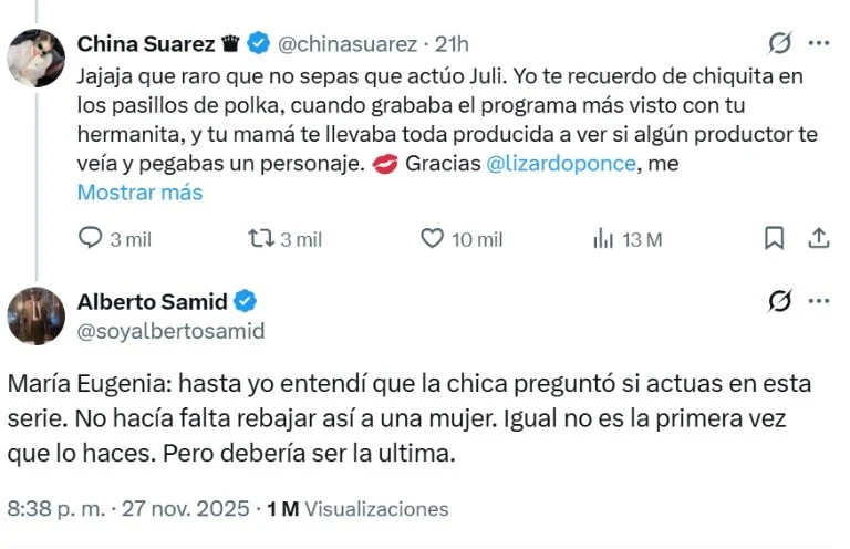 A través de X, el empresario escribió: «María Eugenia: hasta yo entendí que la chica preguntó si actúas en esta serie. No hacía falta rebajar así a una mujer. Igual no es la primera vez que lo haces. Pero debería ser la última». Su mensaje explotó en redes y dejó en claro que mantiene una postura firme desde el histórico conflicto entre la China y Wanda Nara. Su intervención avivó el fuego y volvió a ubicar a Suárez en el centro de la tormenta mediática.