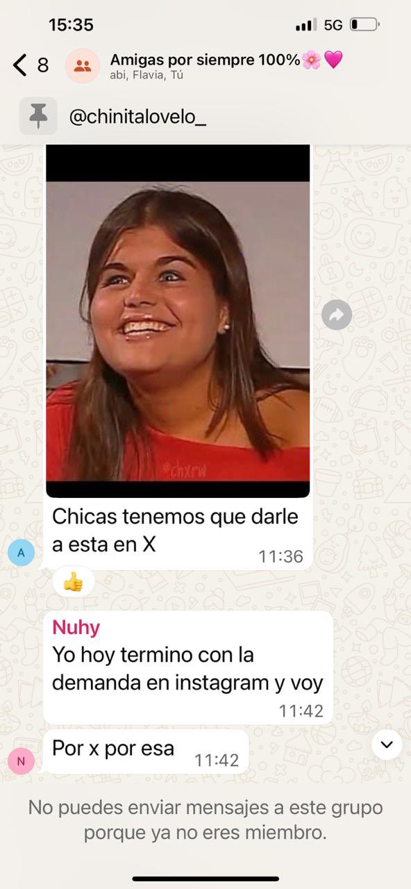 En las capturas compartidas por Balbiani se observan mensajes donde el grupo discute fotos y videos de famosos, con burlas hacia la China Suárez y debates sobre Mauro Icardi. Además, se exponen conversaciones en un chat denominado “Bots de Wanda”, conformado por 51 personas, donde comentan y analizan el contenido publicado por diferentes figuras, con fines de crítica o ataque. Según los mensajes filtrados, Angie sería el próximo objetivo del grupo.