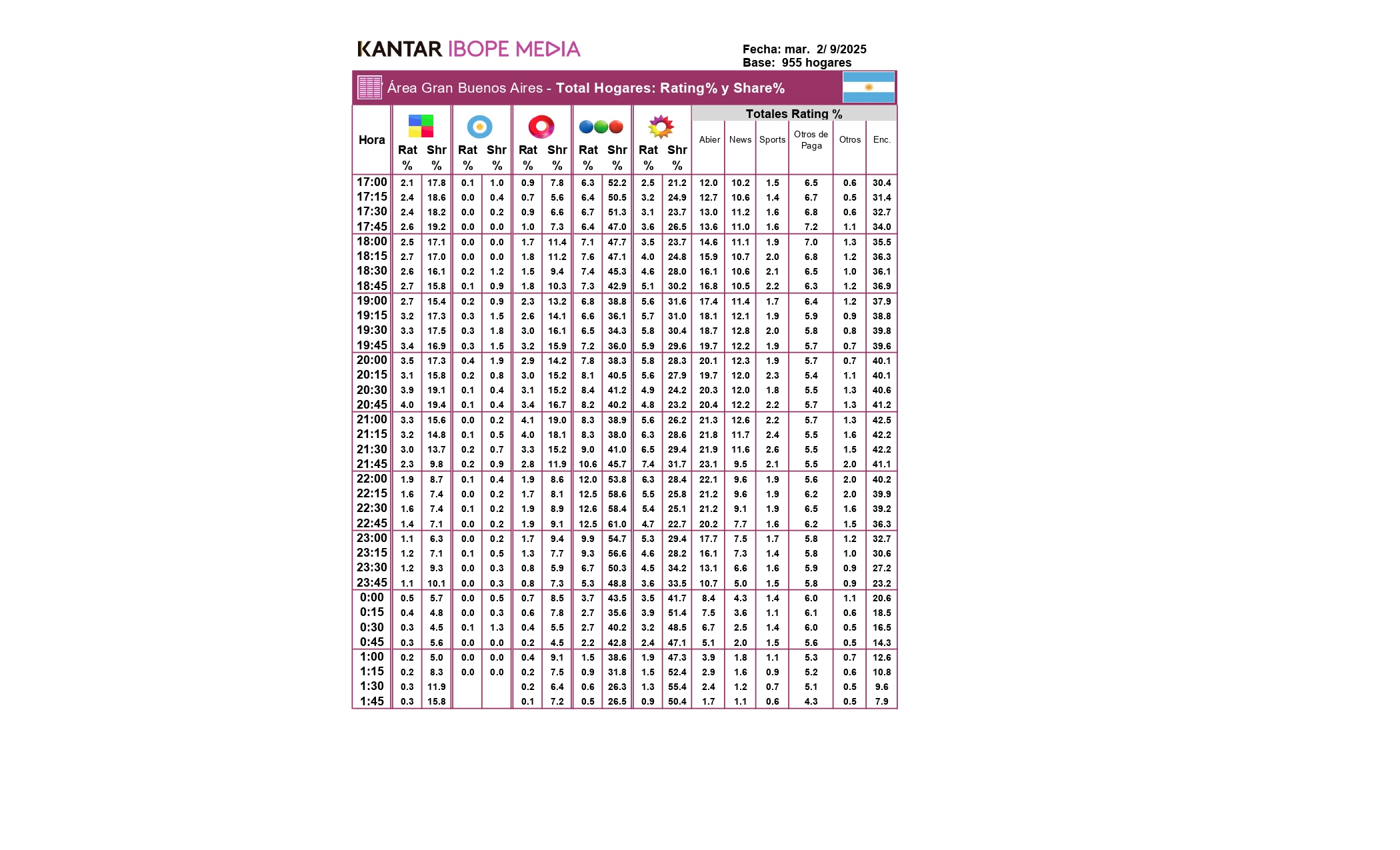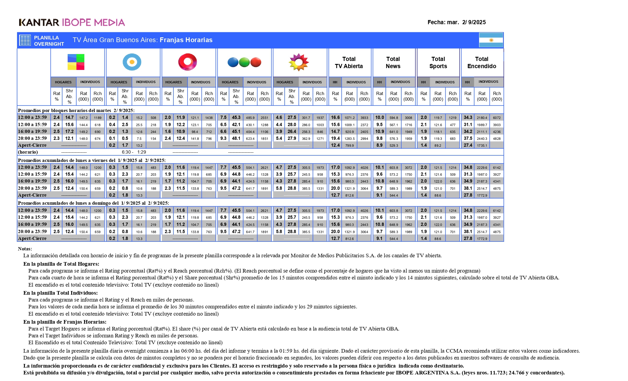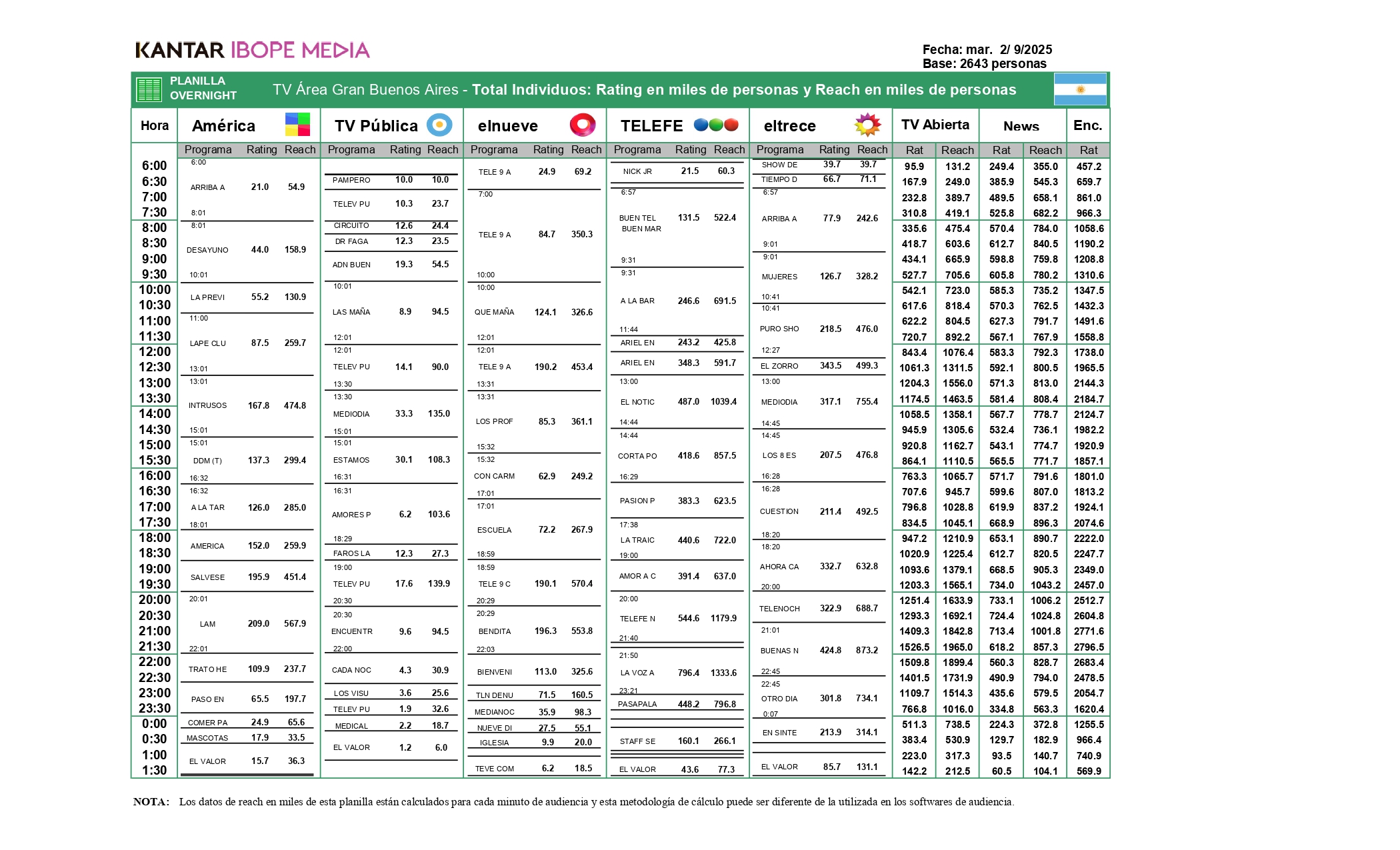 Según las mediciones de Kantar Ibope Media para el martes 2 de septiembre, el panorama televisivo mostró una clara preferencia del público por Telefe a lo largo de casi toda la jornada. El punto más alto del día fue para La Voz Argentina, que alcanzó un impresionante pico de 12.6 puntos de rating a las 22:30 hs, consolidándose como el programa más visto de la televisión.