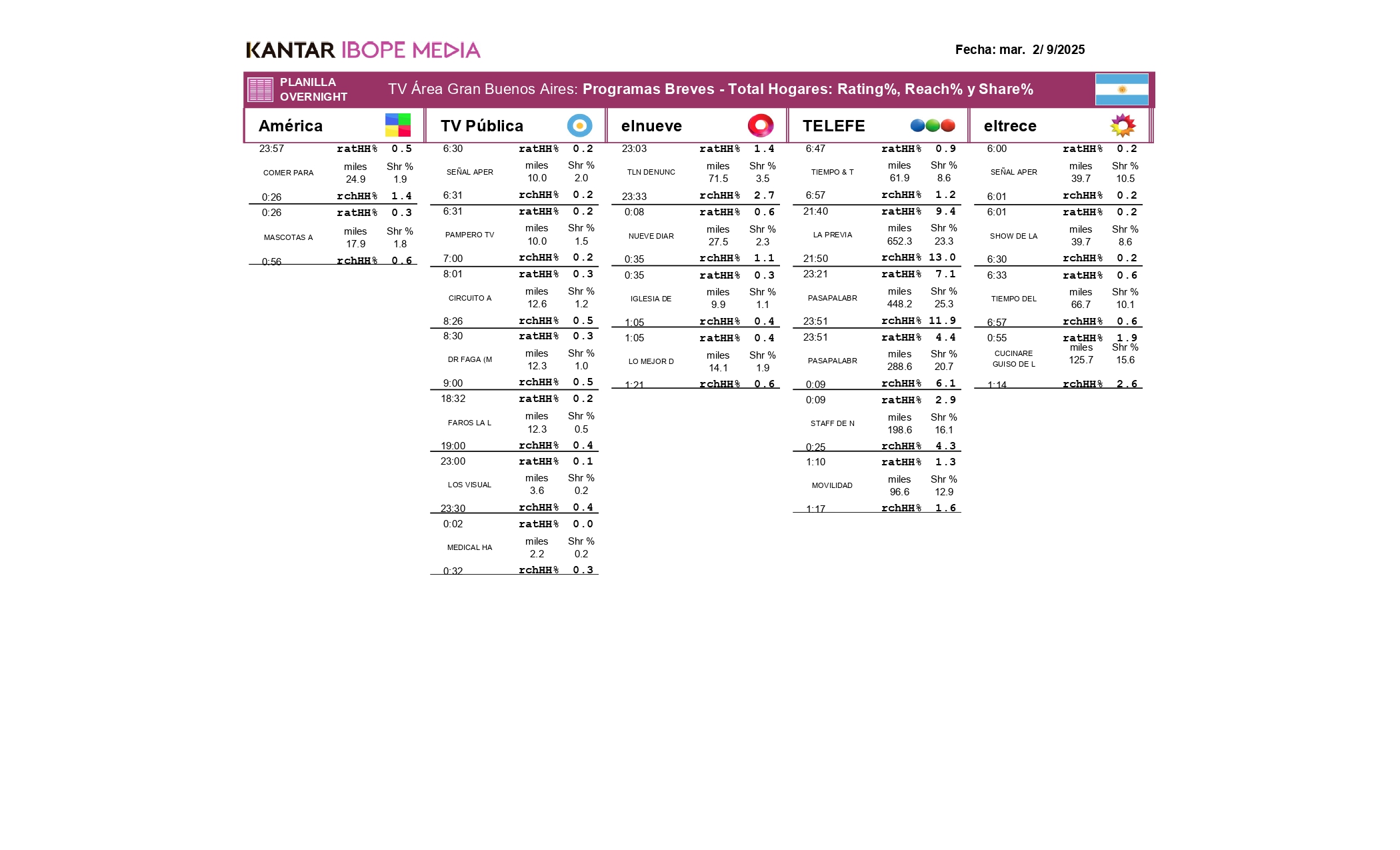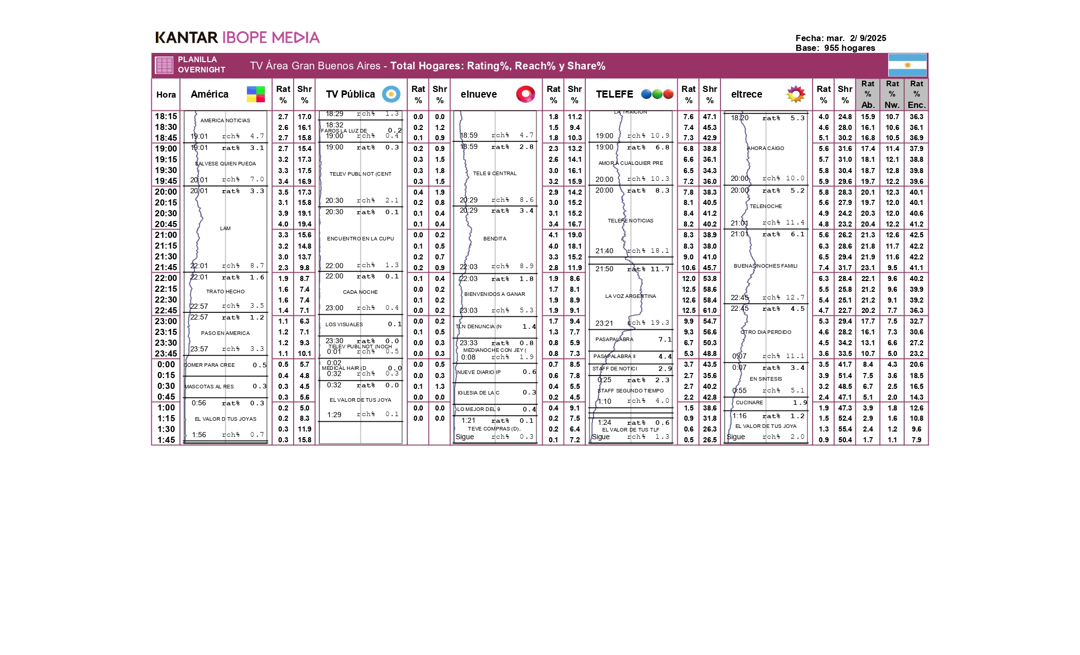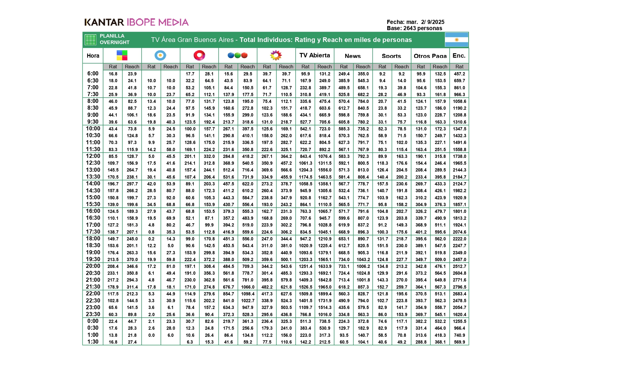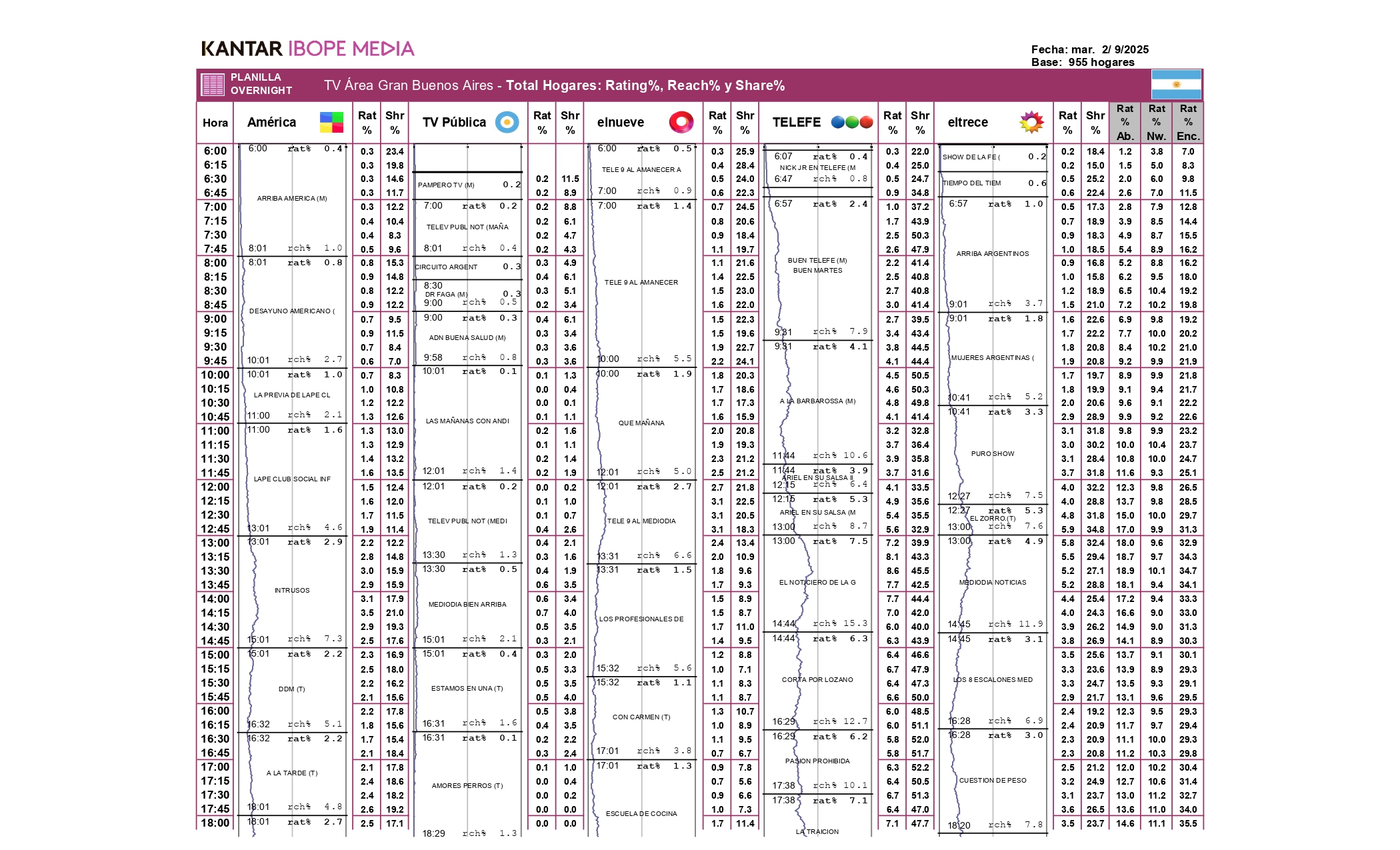 Según las mediciones de Kantar Ibope Media para el martes 2 de septiembre, el panorama televisivo mostró una clara preferencia del público por Telefe a lo largo de casi toda la jornada. El punto más alto del día fue para La Voz Argentina, que alcanzó un impresionante pico de 12.6 puntos de rating a las 22:30 hs, consolidándose como el programa más visto de la televisión.