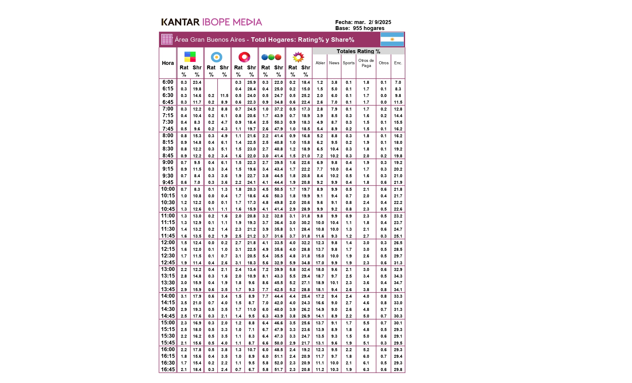 El dominio de Telefe a lo largo del día Más allá de la competencia por nichos, Telefe demostró su liderazgo en todas las franjas horarias. La mañana comenzó con la fuerza de Buen Telefe y se consolidó con A la Barbarossa, que alcanzó picos de 4.8 puntos de rating a las 10:30 hs.