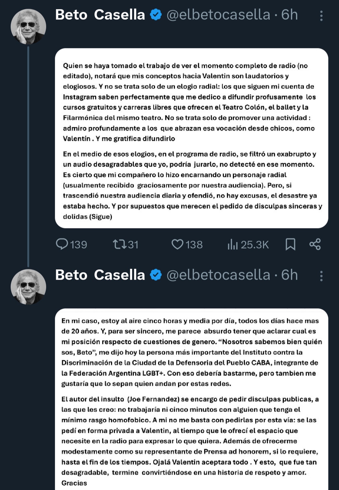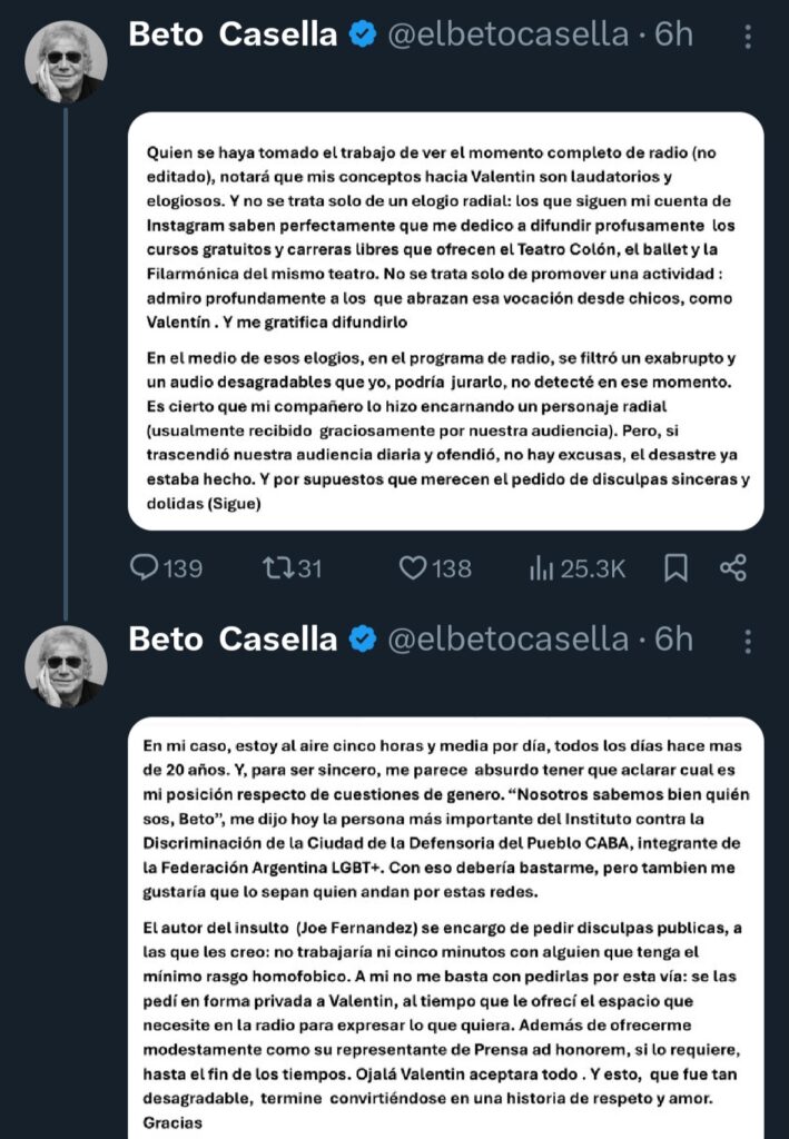Por su parte, Beto Casella utilizó la red social X explicando en una carta abierta lo que sucedió en su programa radial. «Quien se haya tomado el trabajo de ver el momento completo (no editado), notará que mis conceptos hacía Valentín son laudatorios y elogiosos. Y no se trata solo de un elogio radial: los que siguen mi cuenta de Instagram saben perfectamente que me dedico a difundir profusamente los cursos gratuitos y carreras libres que ofrecen el Teatro Colón, el bailar y la filarmónica del mismo», comenzó escribiendo.
