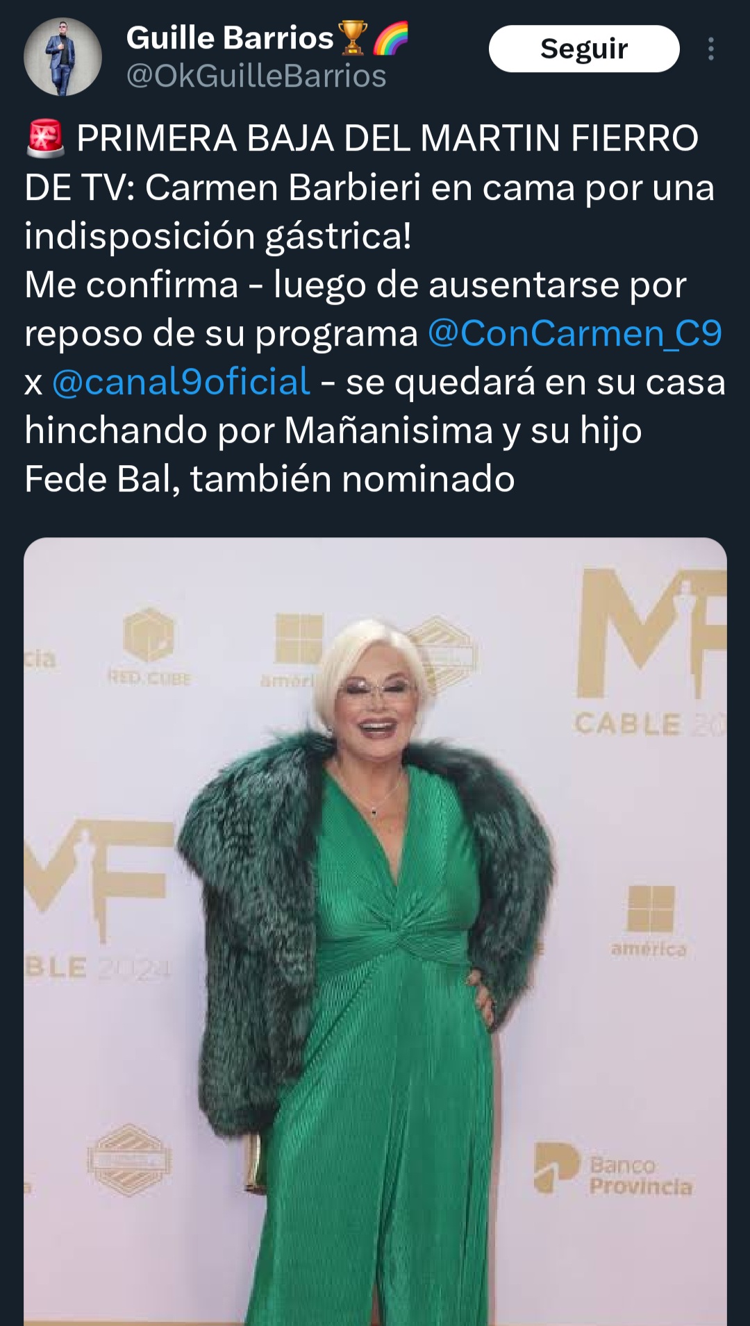«Carmen Barbieri en cama por una indisposición gástrica», escribió el periodista y confirmó que la conductora también se había ausentado en su programa «Con Carmen» (El Nueve) por este mismo motivo..