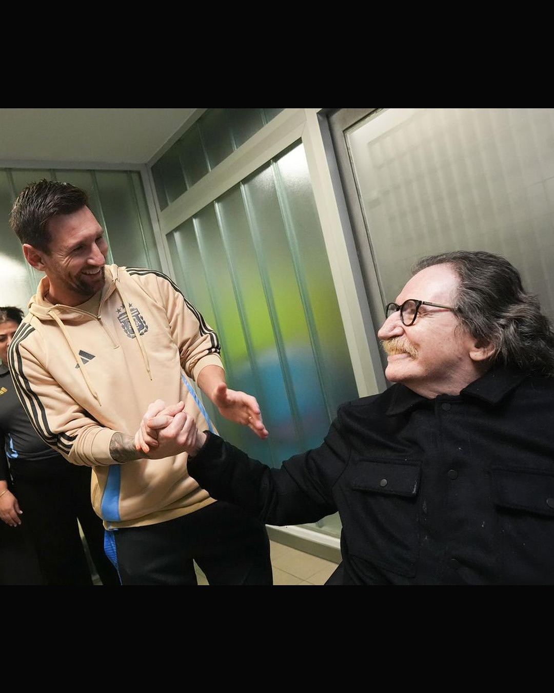 Las primeras imágenes entre el artista y el jugador argentino comenzaron a circular una vez finalizado el encuentro, ya que el cantante fue invitado a los vestuarios del combinado argentino para conocer personalmente al campeón del mundo y bicampeón de América. Charly García fue acompañado por un asistente, ya que se moviliza en silla de ruedas.