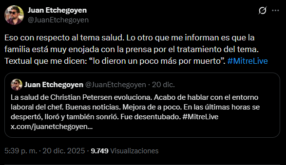En las últimas horas, el panorama comenzó a mostrar signos de alivio. El periodista Juan Etchegoyen confirmó avances importantes en la evolución del chef: “La salud de Christian Petersen evoluciona. Acabo de hablar con el entorno laboral del chef. Buenas noticias”, aseguró. Según detalló, Petersen despertó, reaccionó emocionalmente y fue desentubado, indicadores clave dentro de un proceso de recuperación que, si bien sigue siendo delicado, avanza de manera progresiva.