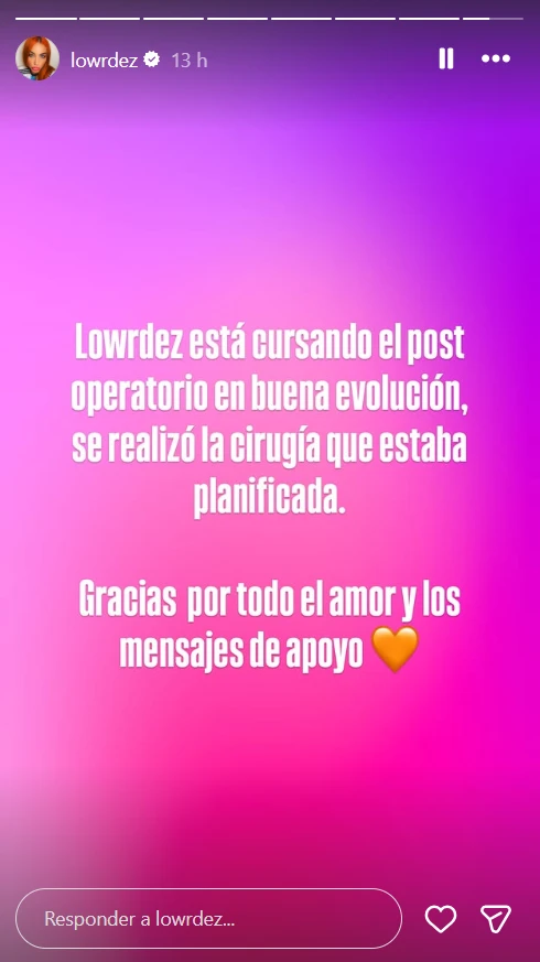 «Lowrdez está cursando el post operatorio en buena evolución, se realizó la cirugía que estaba planificada”, comunicaron. En el mensaje también agradecieron el acompañamiento recibido: “Gracias por todo el amor y los mensajes de apoyo”.