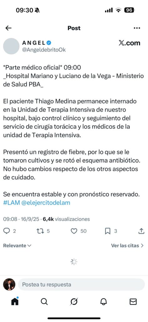 El informe agrega que Thiago presentó un registro de fiebre, por lo que se le realizaron cultivos y se ajustó el esquema antibiótico, mientras que no se reportaron cambios en otros aspectos de su cuidado. A pesar de esta complicación, los médicos indican que se encuentra estable, aunque su pronóstico sigue siendo reservado, reflejando la gravedad de las lesiones y la necesidad de monitoreo constante. La familia de Medina continúa a su lado, recibiendo apoyo del personal del hospital y siguiendo al pie de la letra las indicaciones médicas.