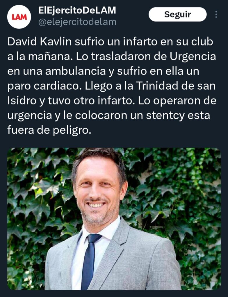 «David Kavlin sufrio un infarto en su club a la mañana. Lo trasladaron de Urgencia en una ambulancia y sufrio en ella un paro cardiaco. Llego a la Trinidad de san Isidro y tuvo otro infarto. Lo operaron de urgencia y le colocaron un stentcy esta fuera de peligro», escribió la cuenta de X del programa que conduce Ángel de Brito.