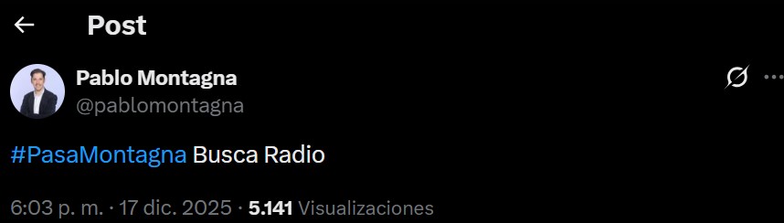 Se trata de Pablo Montagna que recientemente comunicó que no continuará en Radio Rivadavia con su programa «Pasa Montagna». El conductor utilizó su cuenta de X y escribió que su ciclo está en búsqueda de una nueva radio.