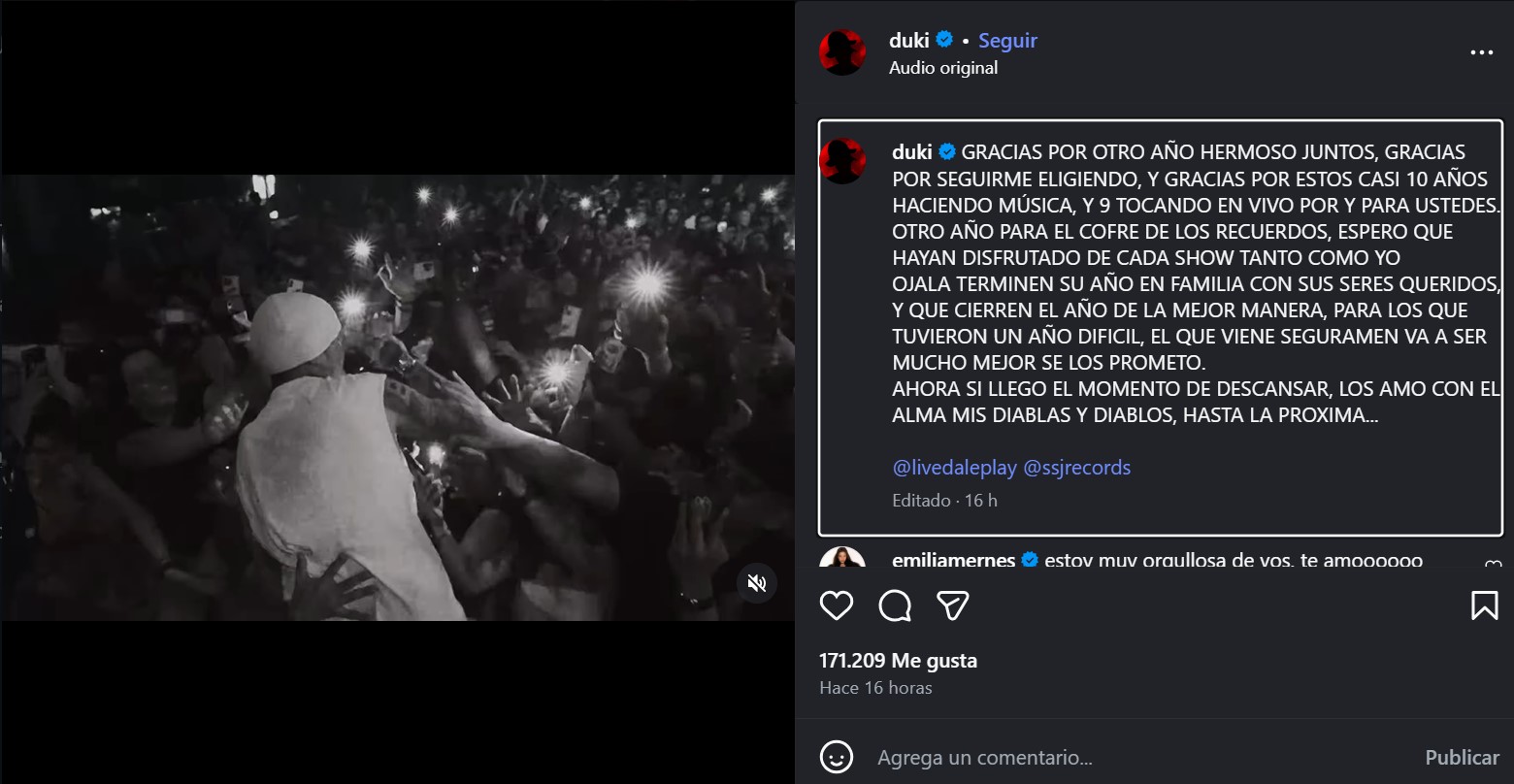 “Gracias por otro año hermoso juntos, gracias por seguirme eligiendo», comenzó escribiendo. «Gracias por seguirme eligiendo y gracias por estos casi 10 años haciendo música y nueve en vivo para ustedes. Otro año para el cofre de los recuerdos, espero que hayan disfrutado de cada show como yo», agregó Duki.