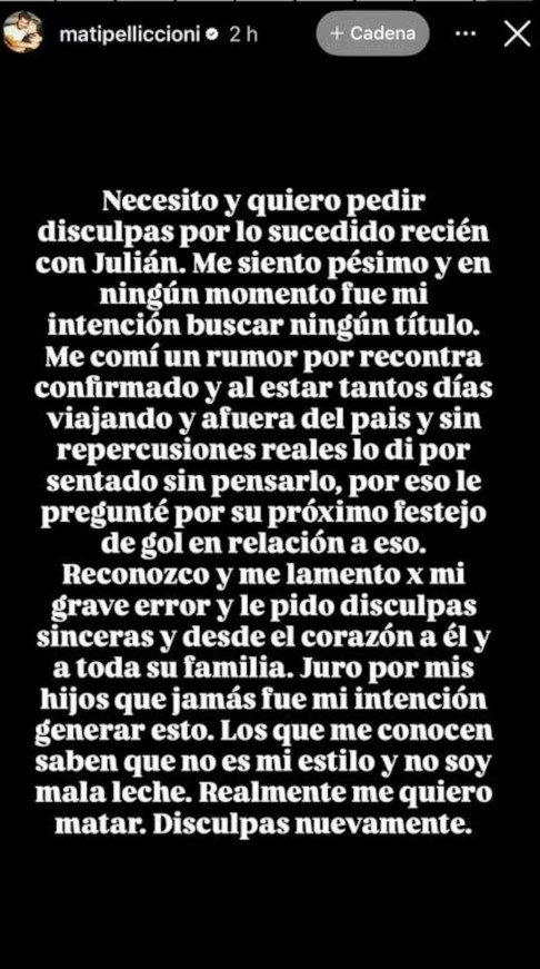 A todo esto, el periodista recibió miles de críticas por revelar una noticia tan privada, es por eso que decidió escribir un contundente descargo pidiendo disculpas. «Necesito y quiero pedir disculpas por lo sucedido recién con Julián. Me siento pésimo y en ningún momento fue mi intención buscar ningún título. Me comí un rumor por recontra confirmado y al estar tantos días viajando y afuera del país y sin repercusiones reales lo di por sentado sin pensarlo, por eso le pregunté por su próximo festejo de gol en relación a eso”, escribió Matías Pelliccioni.