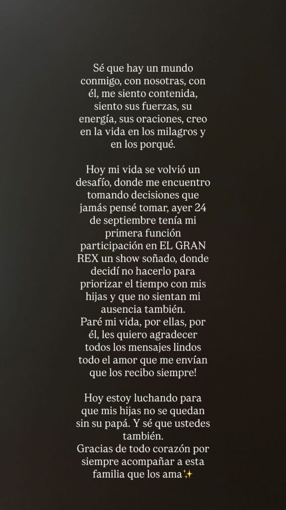 «Hoy mi vida se volvió un desafío, donde me encuentro tomando decisiones que jamás pensé tomar. Ayer 24 de septiembre tenía mi primera función en el Gran Rex, un show soñado, donde decidí no hacerlo para priorizar el tiempo con mis hijas y que no sientan mi ausencia también. Paré mi vida por ellas, por él. siguió.