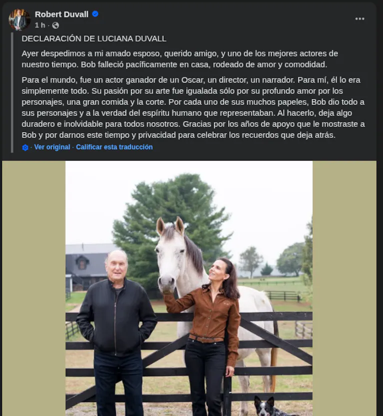 La muerte de Robert Duvall a los 95 años conmovió a Hollywood y al mundo del cine. Sin embargo, fue el mensaje de su esposa argentina, Luciana Pedraza, el que terminó de emocionar a sus seguidores. La actriz y productora confirmó la noticia a través de las redes sociales con una despedida cargada de amor y gratitud.