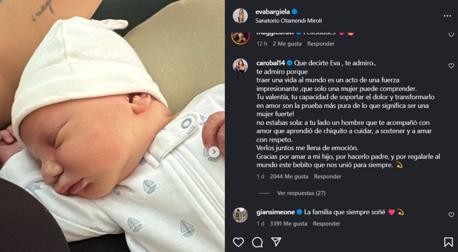 El 25 de octubre, Eva Bargiela y Gianluca Simeone se convirtieron en padres de su primer hijo, Faustino en el Sanatorio Otamendi. La parejita compartió su emoción en redes sociales mostrando al bebé y dando detalles de su nacimiento. Ante la llegada del niño, Carolina Baldini, expresó su emoción de ser abuela.