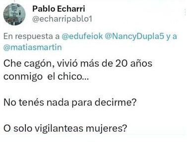 En ese contexto, Pablo Echarri salió públicamente a respaldar a Luca, primero lo hizo a través de un tuit en la red social X en respuesta a un mensaje del periodista Eduardo Feinmann recordando que convivió con el hijo de Matías Martin (y Nancy Dupláa) durante 20 años, que puede ser interpretado como que él se hizo cargo de la crianza del joven dentro de una probable ausencia del padre, Matías Martin. Horas más tarde, al ser abordado por la prensa, el actor claramente alterado por la situación fue consultado por los dichos de Gelblung sobre Luca por ejemplo cuando el conductor afirmó: “es un pelotudo como el padre”, en un primer momento, Echarri cerró con un escueta respuesta: “no me compete, se fue de boca” sin nombrar a Matías y mucho menos contradiciéndolo.