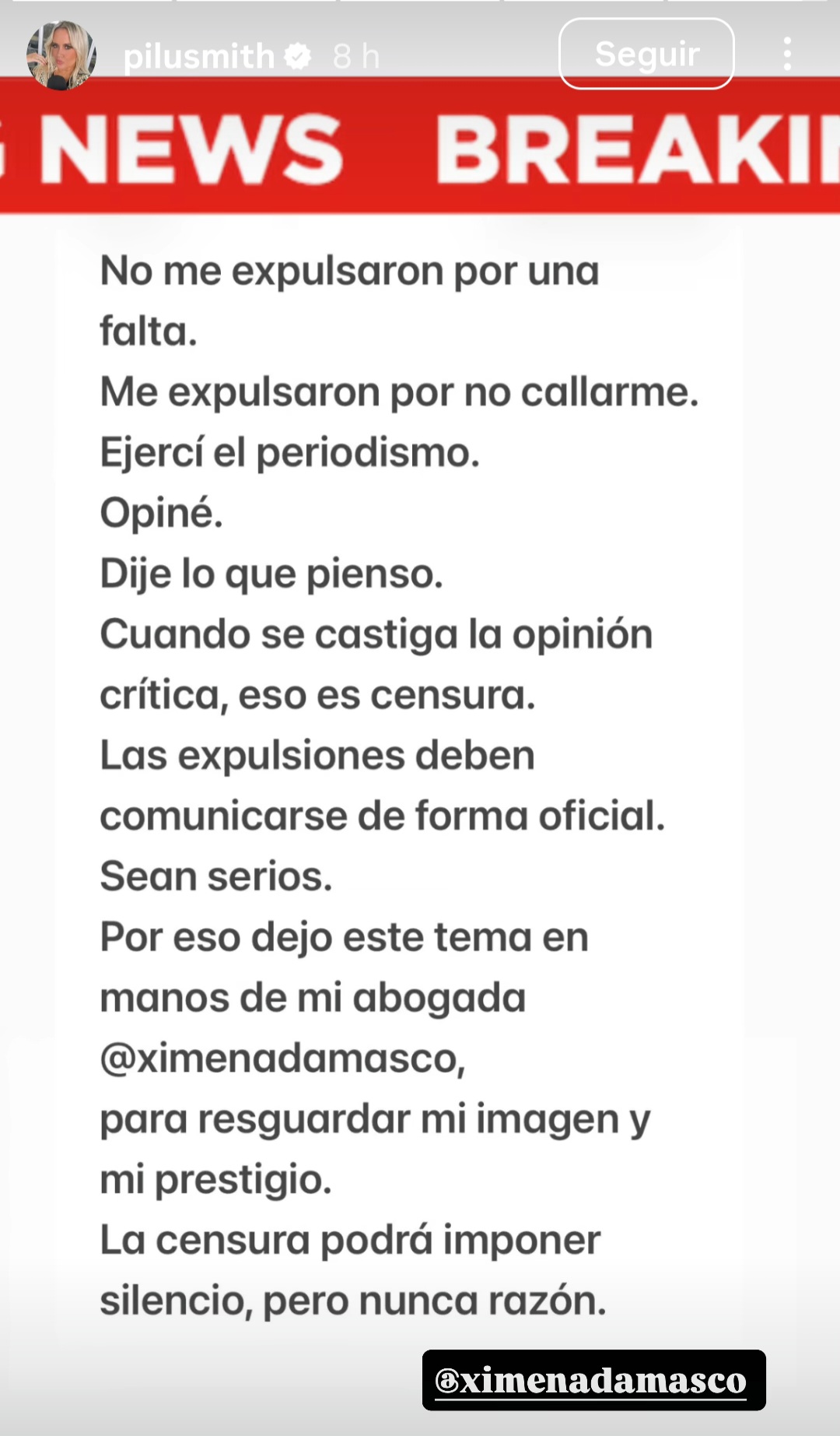 Con la decisión de APTRA, la periodista no se quedó callada y utilizó sus redes sociales para expresar su indignación. «No me expulsaron por una falta. Me expulsaron por no callarme. Ejercí el periodismo. Opiné. Dije lo que pienso. Cuando se castiga la opinión. Crítica, eso es censura. Las expulsiones deben comunicarse de forma oficial. Sean serios. Por eso dejo este tema en manos de mi abogada», escribió Pilar Smith.