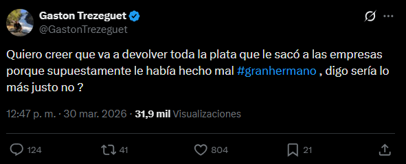 “Quiero creer que va a devolver toda la plata que le sacó a las empresas porque supuestamente le había hecho mal Gran Hermano”, disparó con total indignación. Para cerrar su polémico descargo, agregó de manera irónica: “Digo, sería lo más justo, ¿no?”.
