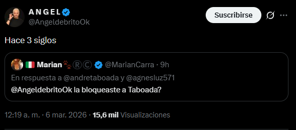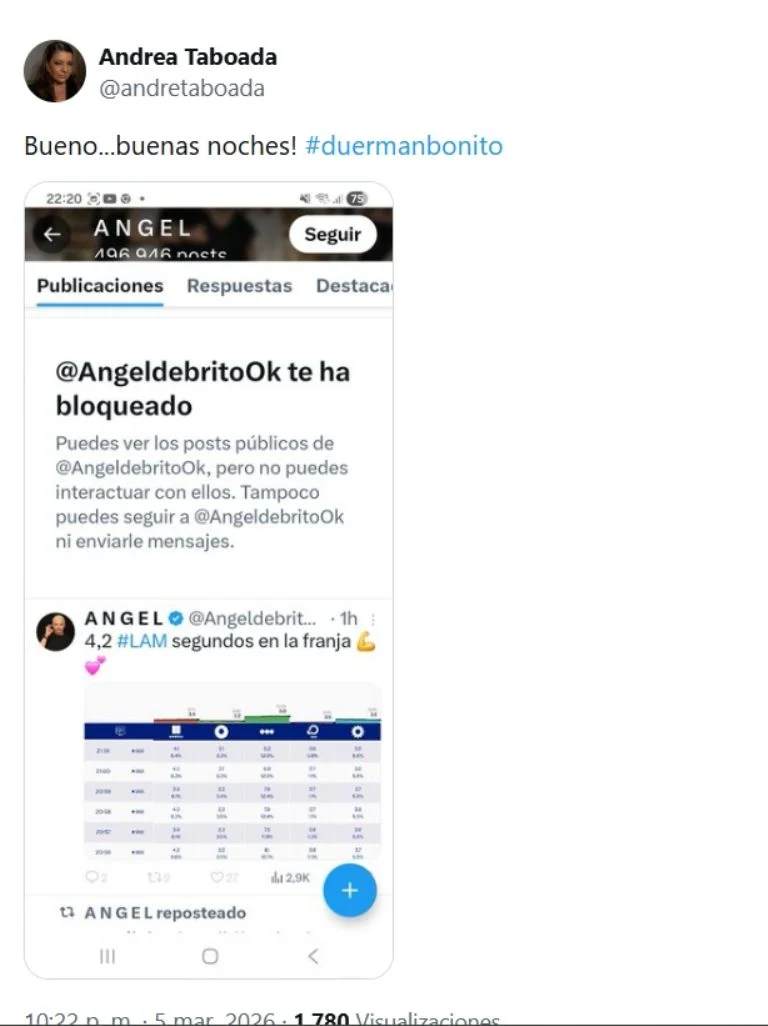 La periodista reaccionó en redes sociales con un fuerte descargo contra el programa y sus excompañeros. “Sería bueno que se tomen el tema en serio, pero…Ahí los tenés. Ojalá no les pase. Gracias por la ayuda a todos”, escribió. Poco después compartió una captura que dejó en evidencia la reacción de su ex amigo: Ángel de Brito la había bloqueado en redes sociales, un gesto que acompañó con un breve mensaje irónico: “Bueno…buenas noches”.