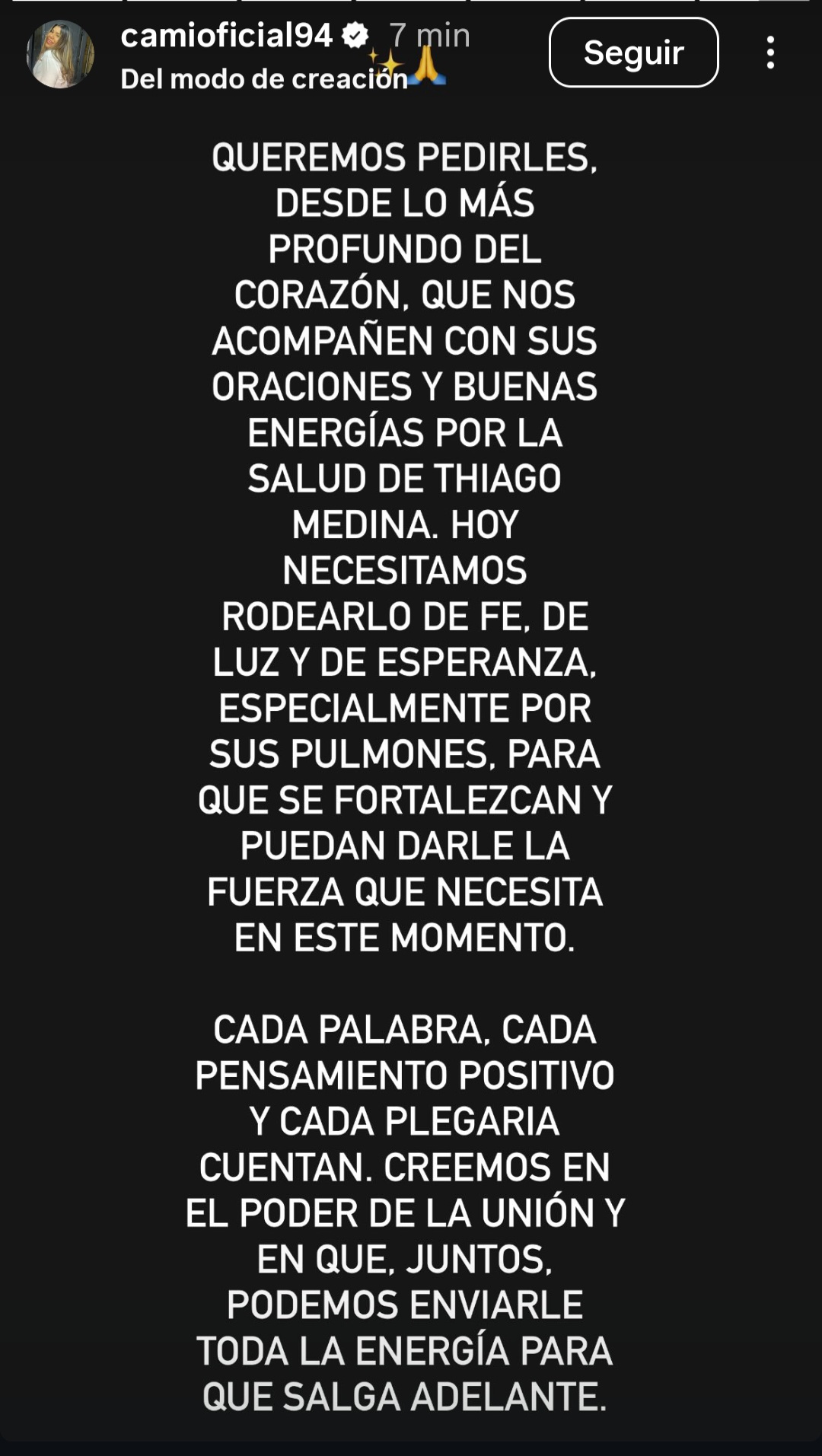 «Queremos pedirles, desde lo más profundo del corazón, que nos acompañen con sus oraciones y buenas energías por la salud de Thiago Medina», comenzó escribiendo la exparticipante de «Cuestión de peso».