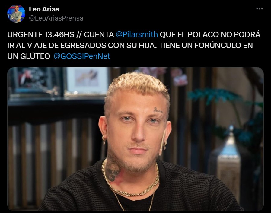 La periodista reveló en «Gossip» (Net TV) que el artista se encuentra internado porque tiene un forúnculo en uno de sus glúteos. «El Polaco no viaja a Bariloche para acompañar a Sol y sus compañeros. Está internado, pero espera viajar en estos días“. Me dicen que tiene un forúnculo en el glúteo. Está muy dolorido, molesto. Los chicos están viajando con otra madre«, comentó Pilar Smith.