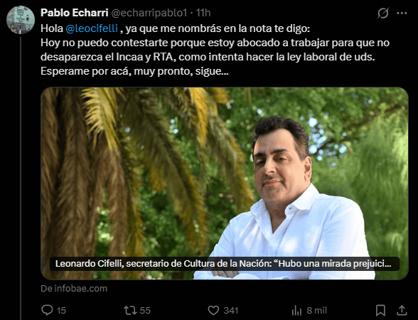 El secretario de Cultura de la Nación, Leonardo Cifelli, volvió a quedar en el centro del debate tras una entrevista con Infobae en la que habló sobre la relación del Gobierno con el sector artístico. Sus declaraciones, donde aseguró que mantiene diálogo con todos los referentes del ambiente, encendieron la polémica luego de mencionar a Pablo Echarri, uno de los actores más críticos de la actual gestión. La respuesta del intérprete no tardó en llegar y el intercambio escaló rápidamente en redes sociales.