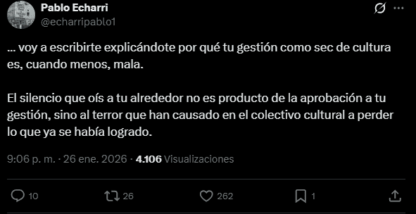 El actor recogió el guante y le contestó públicamente: “Hoy no puedo contestarte porque estoy abocado a trabajar para que no desaparezca el Incaa y RTA… voy a escribirte explicándote por qué tu gestión como sec de cultura es, cuando menos, mala”. Además, fue más allá al advertir: “El silencio que oís a tu alrededor no es producto de la aprobación a tu gestión, sino al terror que han causado en el colectivo cultural”.
