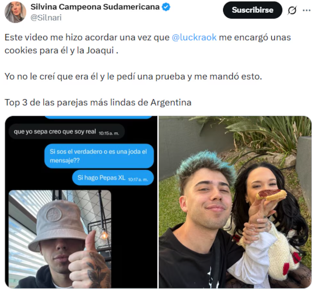 La historia fue revelada por Silvina, quien contó en X cómo comenzó todo. “Este video me hizo acordar una vez que Luck Ra me encargó unas cookies para él y La Joaqui. Yo no le creí que era él y le pedí una prueba y me mandó esto”, relató divertida. En la conversación privada, la mujer fue directa: “¿Es joda tu mensaje? ¿O sos el real?”. Del otro lado, el músico respondió con humor: “Que yo sepa creo que soy real”. Ante la insistencia —“¿Si sos el verdadero o es una joda el mensaje?”— el cantante despejó dudas enviando una foto suya levantando el pulgar desde lo que parecía ser un aeropuerto.