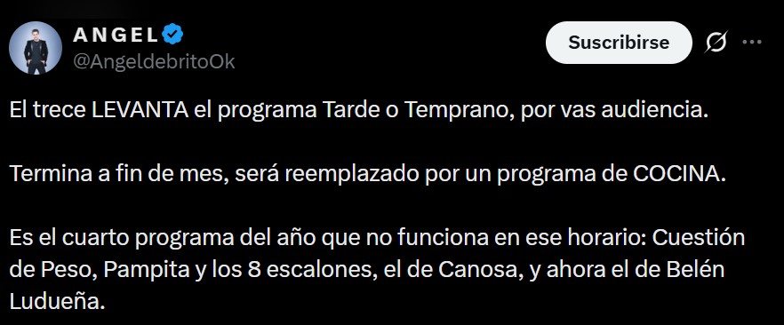 «El trece levanta el programa ‘Tarde o Temprano’, por vas audiencia. Termina a fin de mes, será reemplazado por un programa de cocina», escribió el conductor de «LAM». Y agregó: «Es el cuarto programa del año que no funciona en ese horario: Cuestión de Peso, Pampita y los 8 escalones, el de Canosa, y ahora el de Belén Ludueña».