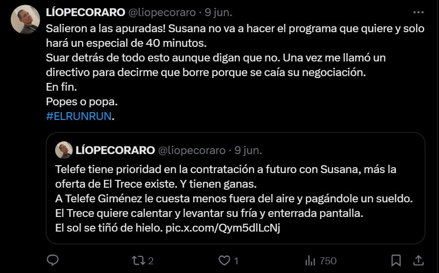 El periodista Lío Pecoraro compartió en su cuenta de X información respecto a las negociaciones que habría mantenido Adrián Suar con la diva de los teléfonos. «Telefe tiene prioridad en la contratación a futuro con Susana, más la oferta de El Trece existe. Y tienen ganas. A Telefe Giménez le cuesta menos fuera del aire y pagándole un sueldo. El Trece quiere calentar y levantar su fría y enterrada pantalla. El sol se tiñó de hielo», comentó el periodista.