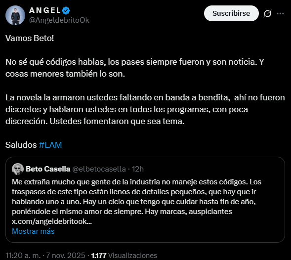 Por su parte, Ángel de Brito defendió su publicación y argumentó que simplemente estaba informando sobre un hecho de interés. “Los pases siempre fueron y son noticia. La novela la armaron ustedes faltando a Bendita, ahí no fueron discretos y hablaron ustedes en todos los programas, con poca discreción. Ustedes fomentaron que sea tema”, explicó el conductor de LAM. Mientras tanto, la tensión entre ambos sigue creciendo, y el pase de Casella, que parecía una jugada segura, ahora queda envuelto en la incertidumbre.