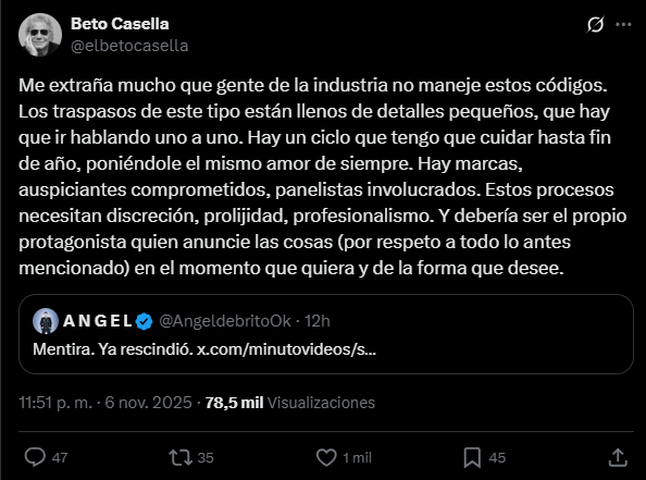 Todo comenzó cuando en Bendita TV Casella negó las versiones difundidas en LAM, pero De Brito replicó en X con un tajante: “Mentira. Ya rescindió”. La respuesta de Beto no tardó en llegar: “No firmé nada con nadie, en todo caso esperen a que lo diga yo que soy el principal interesado”, marcando distancia de la versión de su colega y dejando el pase envuelto en polémica.