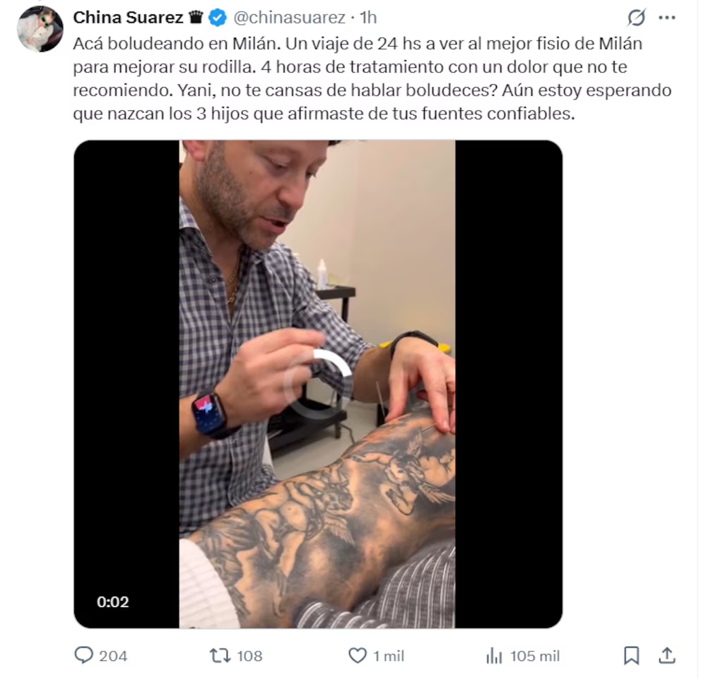 Suárez había compartido imágenes del futbolista del Galatasaray realizando un tratamiento de recuperación y escribió: “Acá boludeando en Milán… Yani, ¿no te cansás de hablar boludeces? Aún estoy esperando que nazcan los 3 hijos que afirmaste de tus fuentes confiables.” Con ese mensaje, la actriz buscó dejar en evidencia que su viaje tuvo un fin médico y no recreativo, como se había sugerido en el programa de espectáculos.