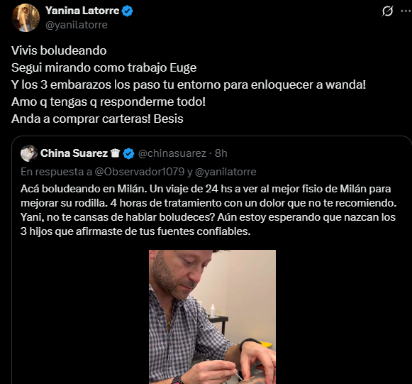 Lejos de quedarse en silencio, Yanina Latorre respondió directamente al tuit de la artista con su característico tono picante: “Vivís boludeando. Seguís mirando cómo trabajo, Euge. Y los 3 embarazos los pasó tu entorno para enloquecer a Wanda. Amo que tengas que responderme todo. ¡Andá a comprar carteras! Besis.” Su mensaje no tardó en generar repercusión, dividiendo a los usuarios entre quienes apoyaron a la panelista y quienes defendieron a la China por salir a aclarar los rumores.