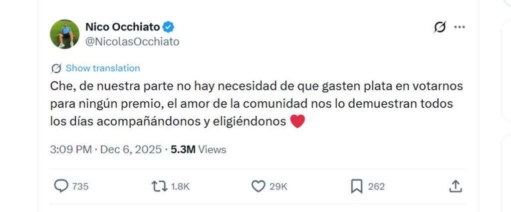 Ante la dispita que se generó, Nico Occhiato utilizó su cuenta de X y dejó en claro su postura: «Che, de nuestra parte no hay necesidad de que gasten plata en votarnos para ningún premio, el amor de la comunidad nos lo demuestran todos los días acompañándonos y eligiéndonos».