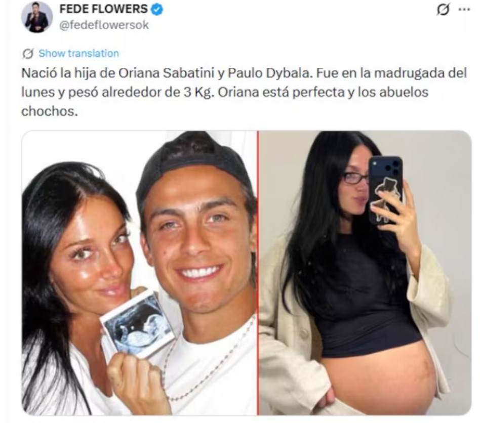 Medios italianos confirmaron que este lunes 2 de marzo nació Gia, la primera hija de Paulo Dybala y Oriana Sabatini en el Hospital Gemelli de Roma. La noticia fue confirmada por Fede Flowers en la red social X. “Nació la hija de Oriana Sabatini y Paulo Dybala. Fue en la madrugada del lunes y pesó alrededor de 3 Kg. Oriana está perfecta y los abuelos chochos”.