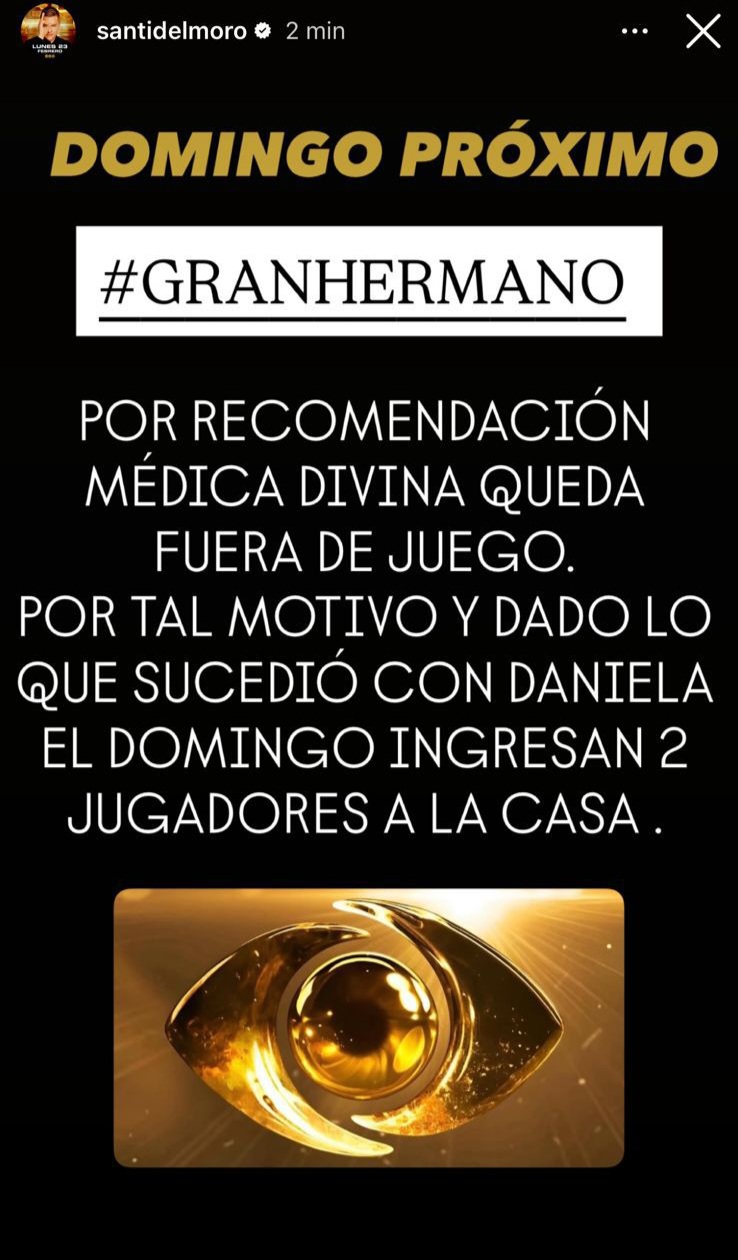 La noticia la confirmó Santiago del Moro en una historia de Instagram. «Por recomendación médica, Divina queda fuera de juego. Por tal motivo y dado lo que sucedió con Daniela el domingo ingresan dos jugadores a la casa».
