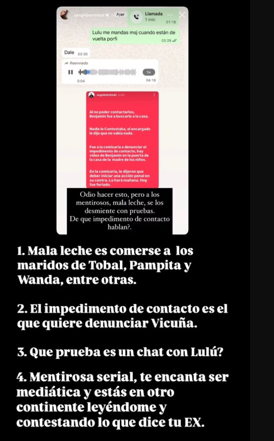 «Mala leche es comerse a los maridos de Tobal, Pampita, Wanda, entre otras“, escribió de Brito. ¿Qué prueba es un chat con Lulú?», agregó. «Mentirosa serial, te encanta ser mediática y estás en otro continente leyéndome y contestando lo que dice tu ex“, aseguró.