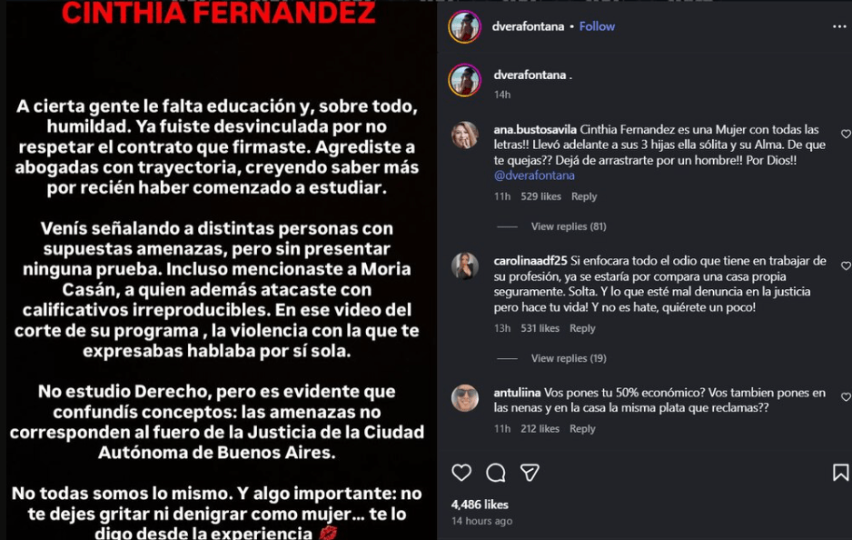 Todo comenzó cuando la arquitecta publicó un extenso y fulminante mensaje apuntando contra la actual pareja del abogado. “A cierta gente le falta educación y, sobre todo, humildad”, escribió Fontana, haciendo clara referencia a su reciente incursión en estudios jurídicos.