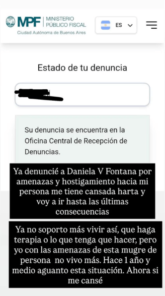 La respuesta no tardó en llegar y fue absolutamente letal. A través de sus historias, la figura televisiva mostró el comprobante del Ministerio Público Fiscal de la Ciudad de Buenos Aires. “Ya denuncié a Daniela Vera Fontana”, advirtió furiosa.