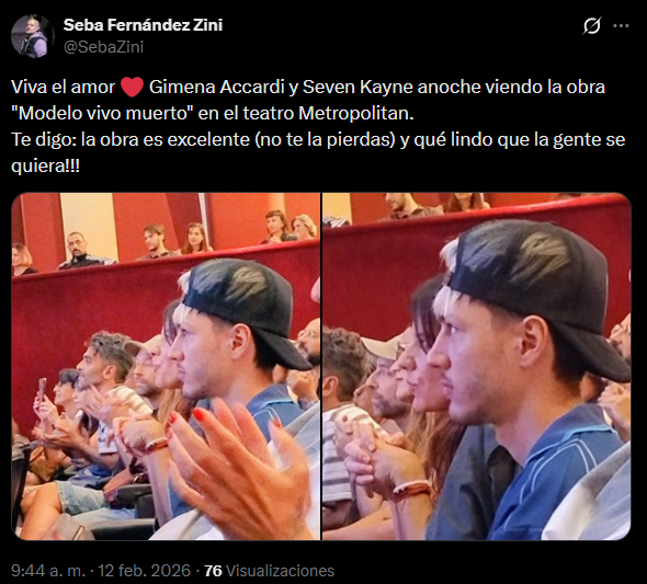 El periodista Seba Fernández publicó en su cuenta de X: «Viva el amor Gimena Accardi y Seven Kayne anoche viendo la obra «Modelo vivo muerto» en el teatro Metropolitan. Te digo: la obra es excelente (no te la pierdas) y qué lindo que la gente se quiera!!!». El mensaje, breve pero sugestivo, volvió a instalar la pregunta que circula en el ambiente artístico: ¿hay algo más que compañerismo entre la actriz y el músico?