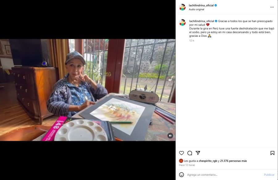 En el video, María Antonieta expresó: “Gracias a todos los que se han preocupado por mi salud. Durante la gira en Perú tuve una fuerte deshidratación que me bajó el sodio, pero ya estoy en mi casa descansando y todo está bien, gracias a Dios”. La actriz mostró su rutina cotidiana, dibujando y bromeando frente a la cámara, y agregó: “En fin, lo estoy pasando muy bien. Ojalá que ustedes la pasen tan bien como lo estoy pasando yo. Gracias. Los quiero muchísimo”.