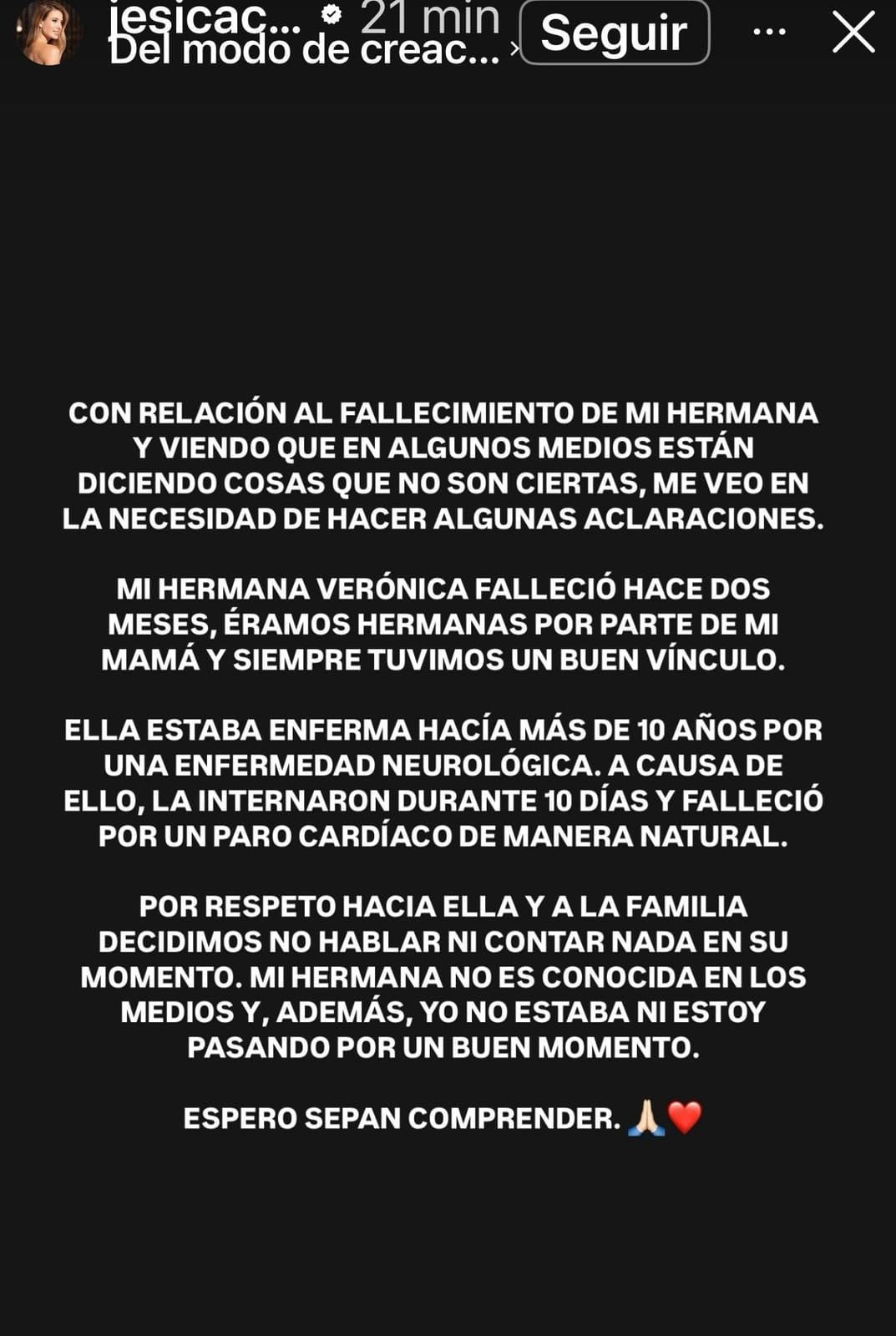 Desde sus redes sociales, Jésica Cirio rompió el silencio sobre la muerte de su hermana Verónica. «Falleció hace dos meses, éramos hermanas por parte de mi mamá y siempre tuvimos un buen vínculo. Están diciendo cosas que no son ciertas«, señaló.