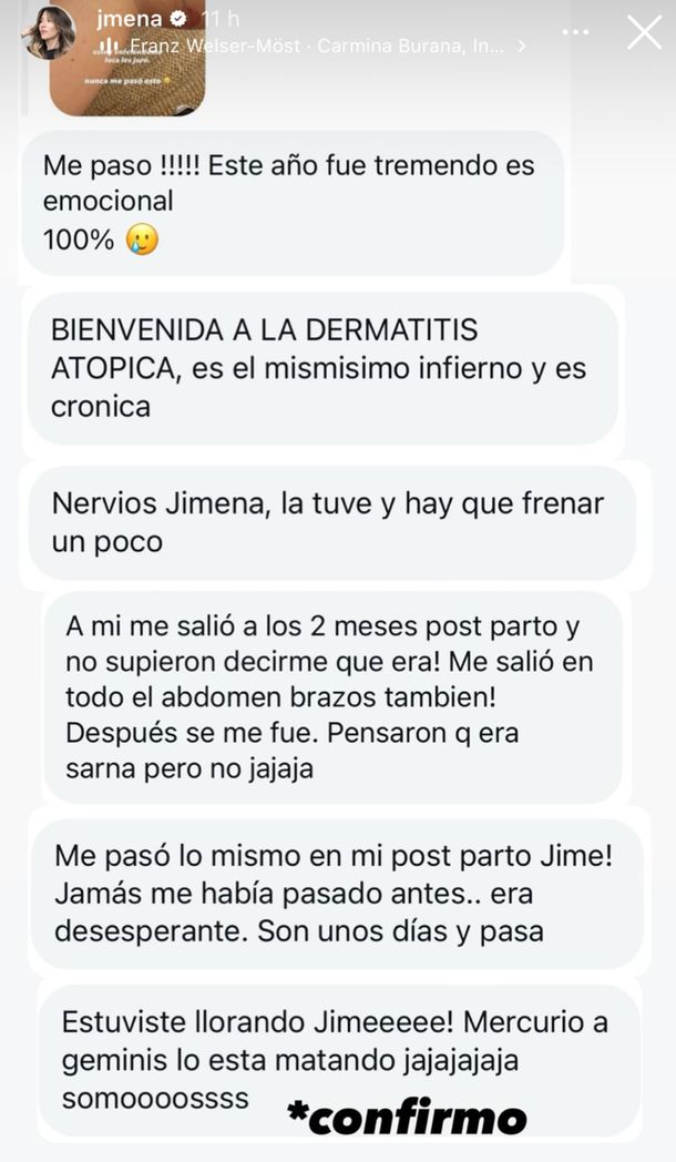 “Estoy con una dermatitis que me está enloqueciendo, por todo el cuerpo. Así que si me ven rascarme en los videos es que no puedo más”, expresó Jimena en una serie de historias de Instagram, mientras mostraba las zonas irritadas. En las imágenes se la ve señalando su brazo y abdomen, visiblemente afectados, y acompañó las fotos con una descripción que reflejó su malestar: “Pica, y te pica, y te pica… Te rascás y te alivia y te pica en otro lado. Es enloquecedor”.
