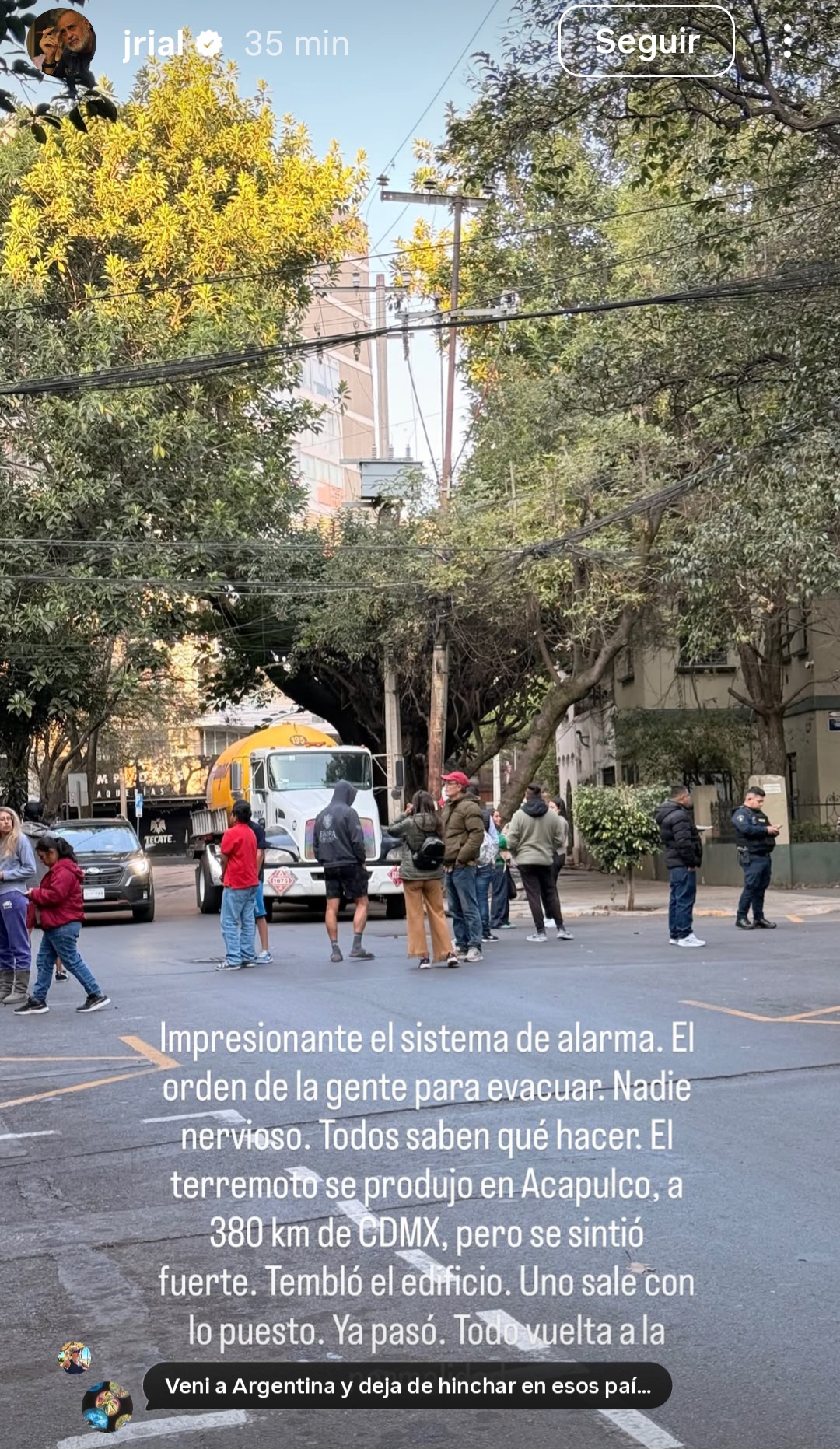 En otra historia, el periodista compartió la tranquilidad de los ciudadanos ante el terremoto. «Impresionante el sistrma de alarma. El orden de la gente para evacuar. Nadie nervioso, todos saben que hacer», explicó.