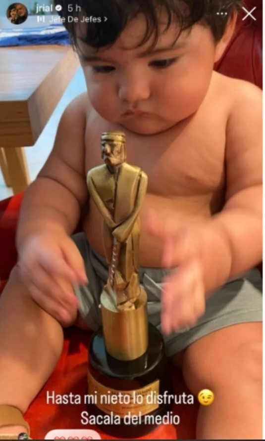 En la imagen, el conductor aseguró que esperaba su presencia, pero eso no ocurrió. A raíz de esto comenzó un intenso ida y vuelta entre ambos que parece no tener fin. Ahora Rial decidió redoblar la apuesta al compartir una foto de su nieto Amadeo con el Martín Fierro. «Hasta mi nieto lo disfruta. Sácala del medio», escribió el conductor.