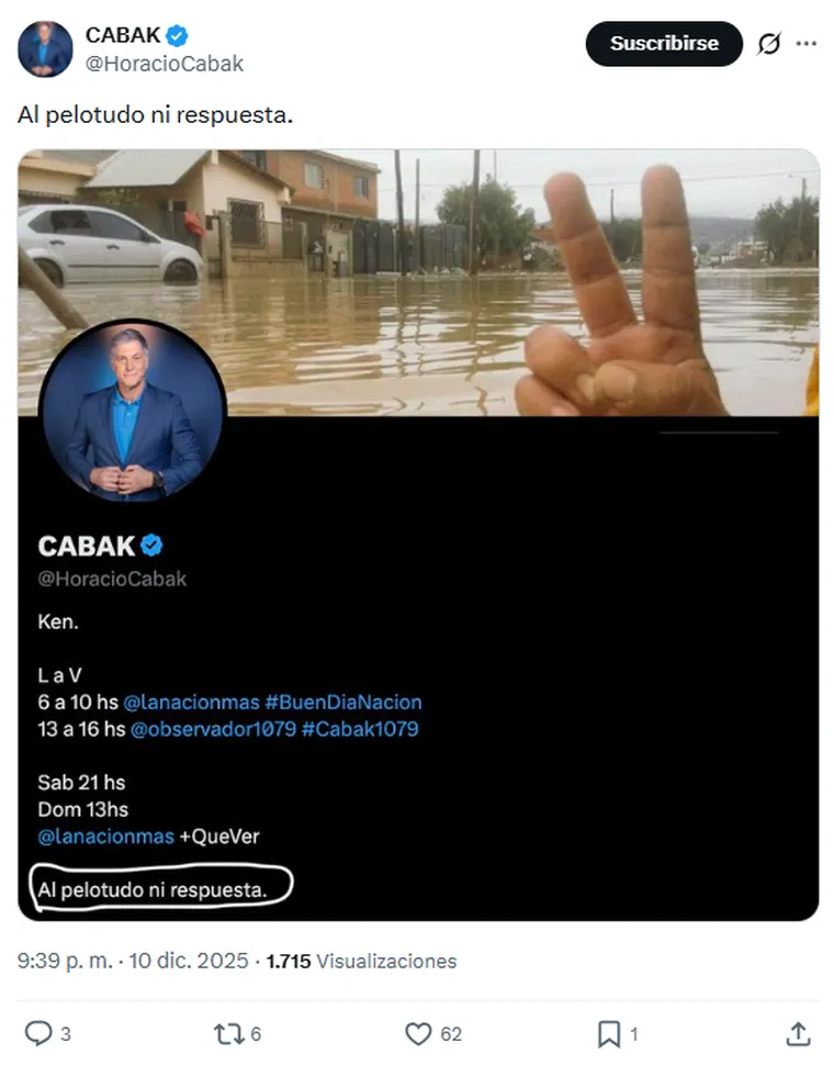 La guerra comenzó cuando el exmodelo bloqueó al periodista en la red social X. Según contó el conductor de «Argenzuela» su mujer detectó en el acto la infidelidad de Cabak. «Era a tu mujer cuando te descubrió pajeandote con otra en terapia intensiva. ¡Fantasma!”, lanzó sin filtro.