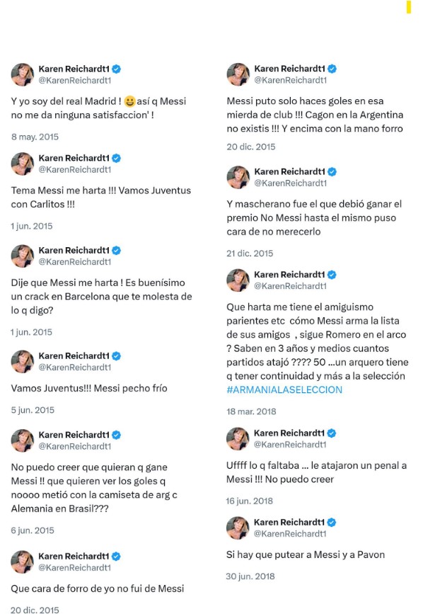 Sin embargo, los internautas se habrían dado cuenta que los tuits contra el astro argentino son reales y se lo dejaron saber en los comentarios con tuits contra el argentino. «Ay Karen, Karen… Si vas a mentir, para sostener la mentira, tenés que al menos borrar los tuits! Acabo de entrar a tu perfil y buscar algunos y en efecto, ahí están. Mentís tan mal que representas excelentemente a LLA», «Si estuviste borrando twits, entonces los escribiste vos. Tendrías que haber contratado una empresa que se dedica a limpiar tu cuenta cuando estas expuesta, pero no te da la cabeza», «mira que si los buscas están . peor es que los desmientas cuando no es así», fueron algunas de las reacciones de los usuarios de la red social X.