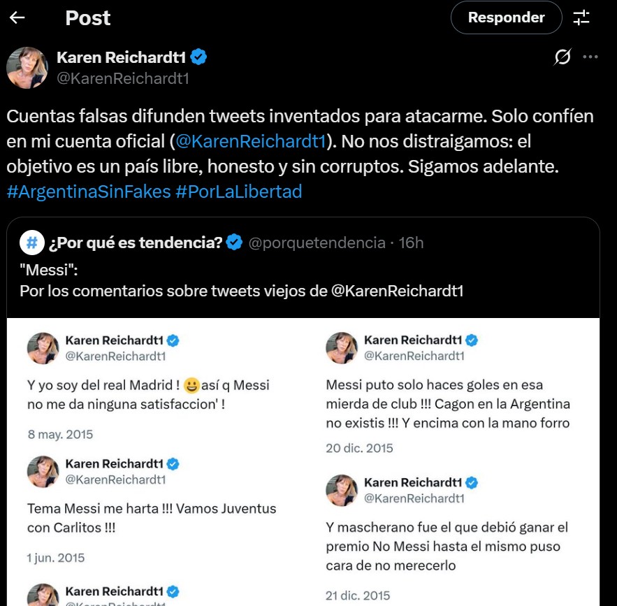 ). No nos distraigamos: el objetivo es un país libre, honesto y sin corruptos. Sigamos adelante. #ArgentinaSinFakes #PorLaLibertad», escribió la candidata. En ese contexto, Karen Reichdart aseguró que Messi es de su «agrado», en un comentario cuando le consultaron al respecto.